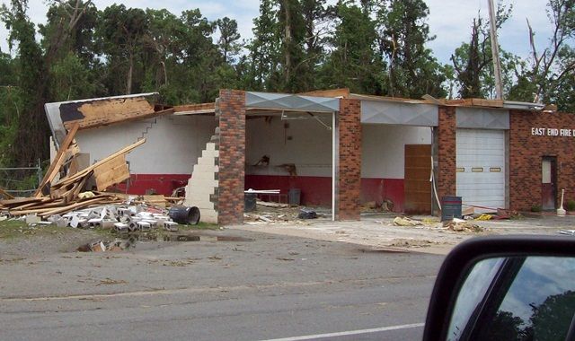 Fire station, beyond repair, roofs covered in tarps